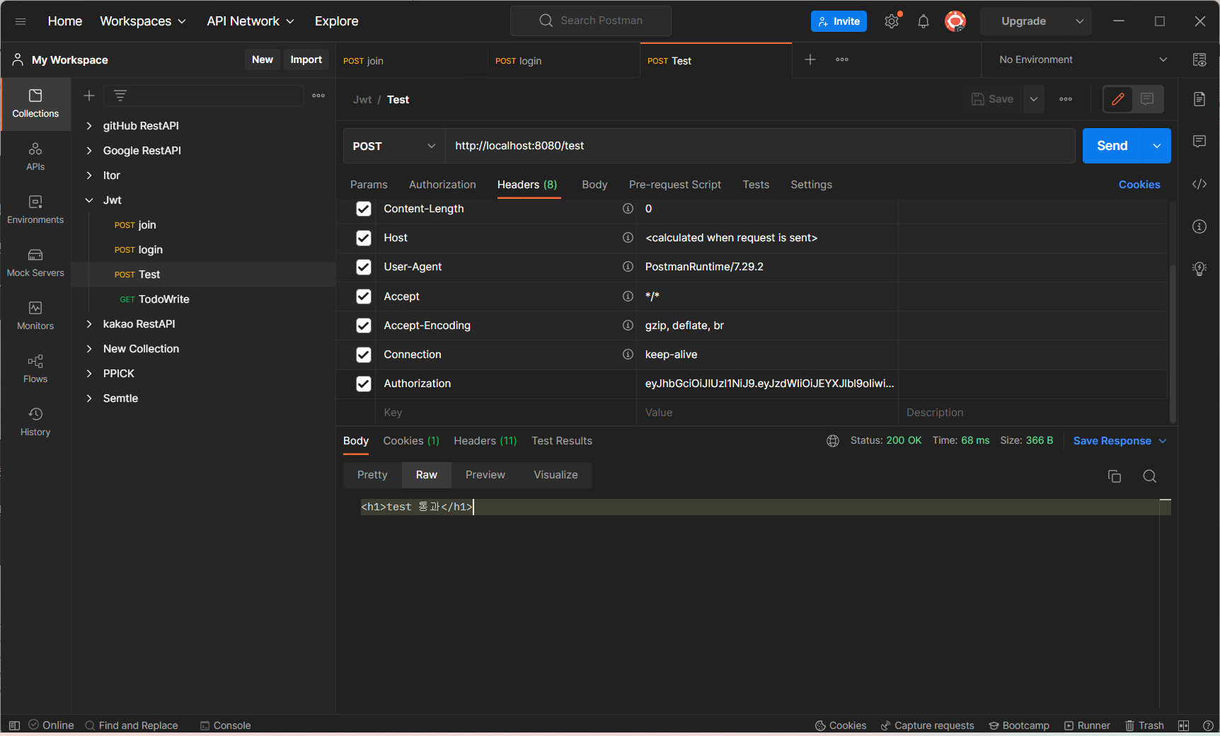 JwtApplication을 실행하여 서버를 활성화시켜준 뒤 POSTMAN을 이용하여 테스트해보겠습니다.