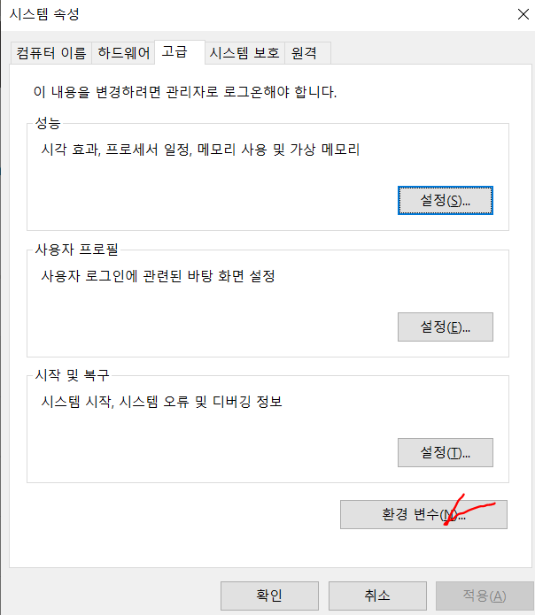 윈도우 10 기준) 윈도우 로고 키를 누르시고 환경 변수라고 검색을 하시면 시스템 환경 변수 탭이 뜨는데 눌러줍니다.